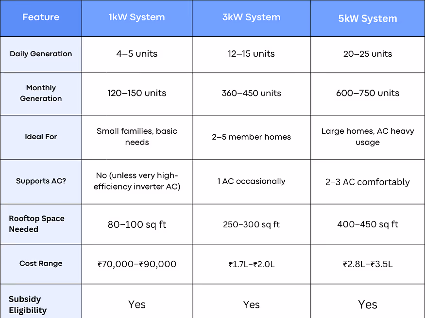 Choosing between a 1kW, 3kW, and 5kW solar system becomes easy when you understand your electricity usage, appliance load, budget, and roof space. This step-by-step guide simplifies the decision-making process for every type of Indian household.
