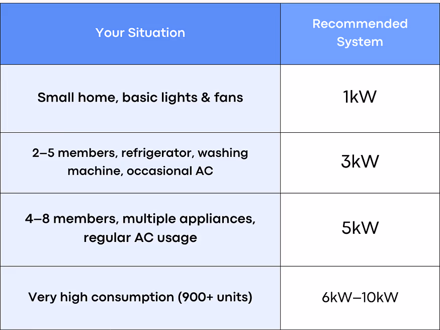 If the answer is yes to any of these, choose a slightly bigger system (e.g., move from 3kW → 5kW).
